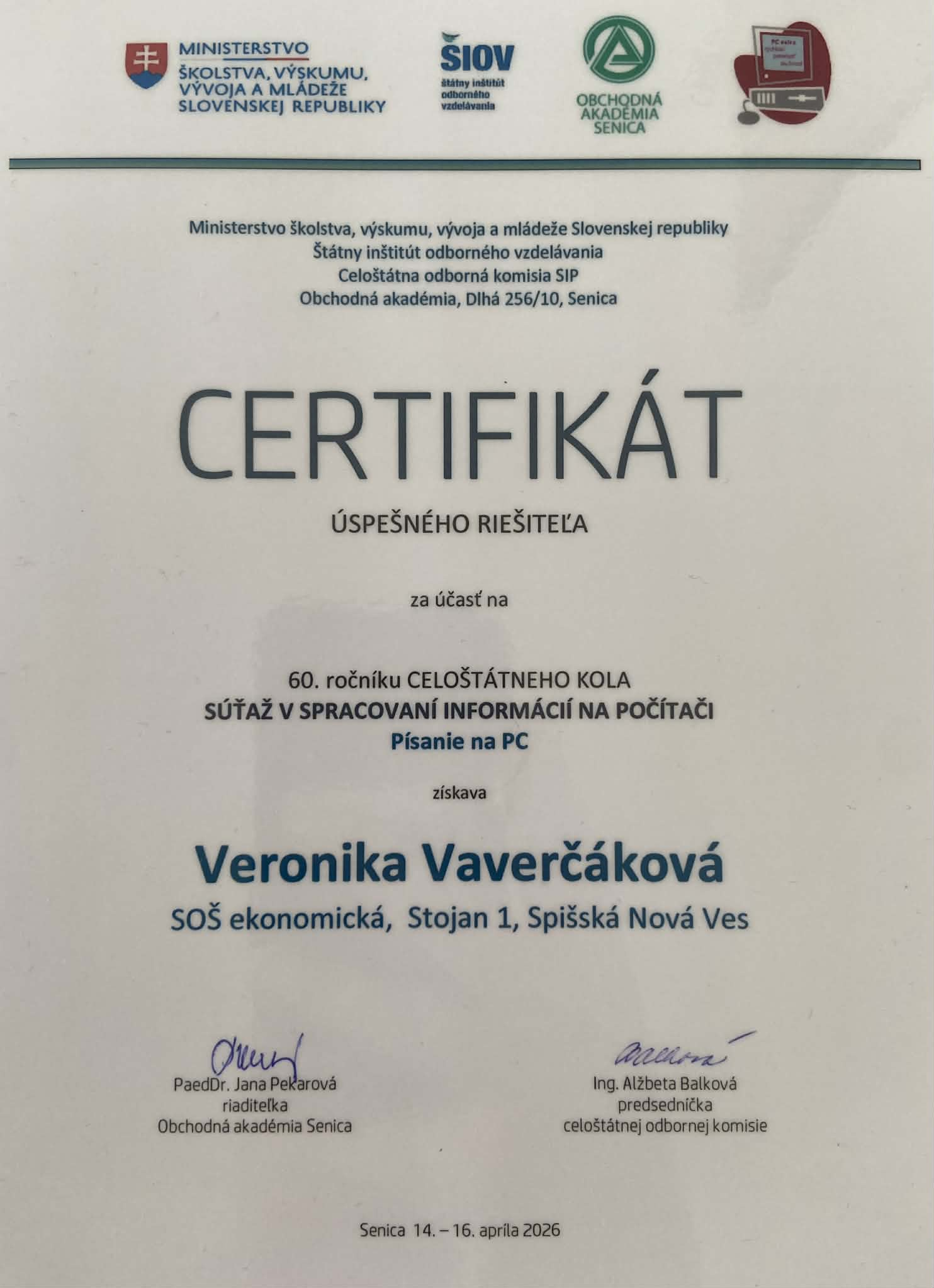 Strednú odbornú školu ekonomickú v Spišskej Novej Vsi reprezentovala Veronika Vaverčáková, ktorá v disciplíne písanie na počítači obsadila napriek veľmi silnej konkurencii pekné 14. miesto s počtom čistých úderov za minútu 329,7 a percentom chýb 0,17.